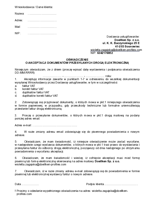 Oświadczenie o akceptacji dokumentów przesyłanych drogą elektroniczną